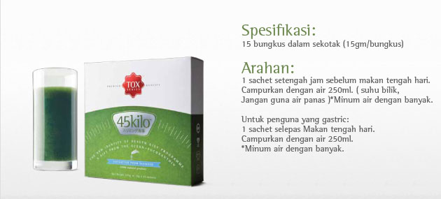 45kilo™ disyorkan untuk pengawalan obesiti dan penguraian lemak di bahagian seperti pinggang, perut, punggung, riba dan lengan. Ia juga mencegah edema dan mengawal pengambilan kalori anda, meningkatkan kadar metabolisme dan mengenyah toksik. 45kilo™ mampu mengekalkan badan-berat dan ia juga mematuhi standard pengurangan berat badan Pertubuhan Kesihatan Sedunia (WHO).